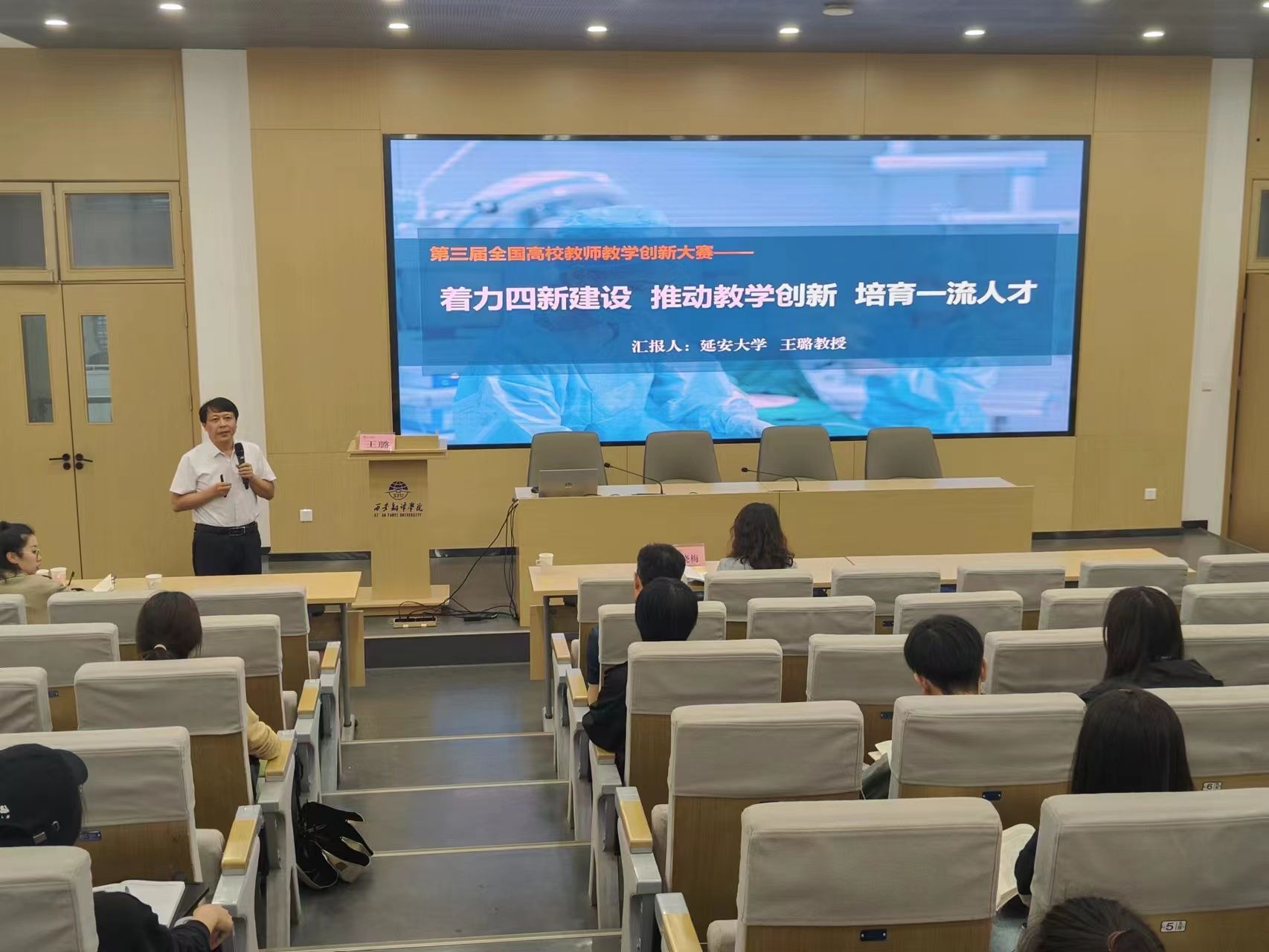 9月19日下午,由西安翻译学院教务处主办的“2023年教师教学能力提升系列活动(第七期)”在923T学术报告厅举行。本期活动特邀请延安大学王璐教授,作主题为“着力四新建设 推动教学创新 培育一流人才”的讲座。讲座由教务处处长秦晓梅主持,教师150余人参加了本次讲座。